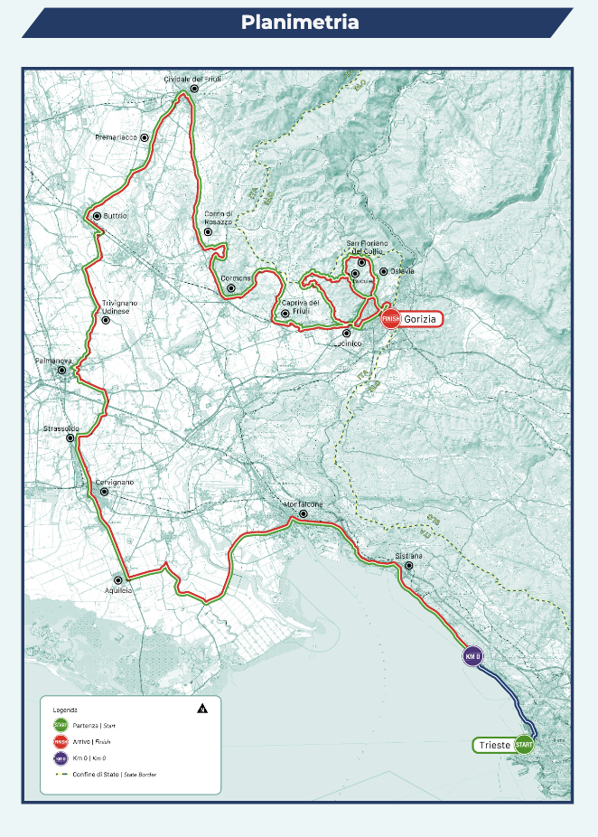 Il via verrà dato a Trieste e, dopo un tratto in linea che toccherà località famose come Aquileia, Palmanova, Cividale del Friuli, si raggiungerà Gorizia, la capitale italiana della cultura 2025. Lì ci sarà un circuito con la salita di San Floriano del Collio da ripetere quattro volte che dista circa 3 Km dall’arrivo.