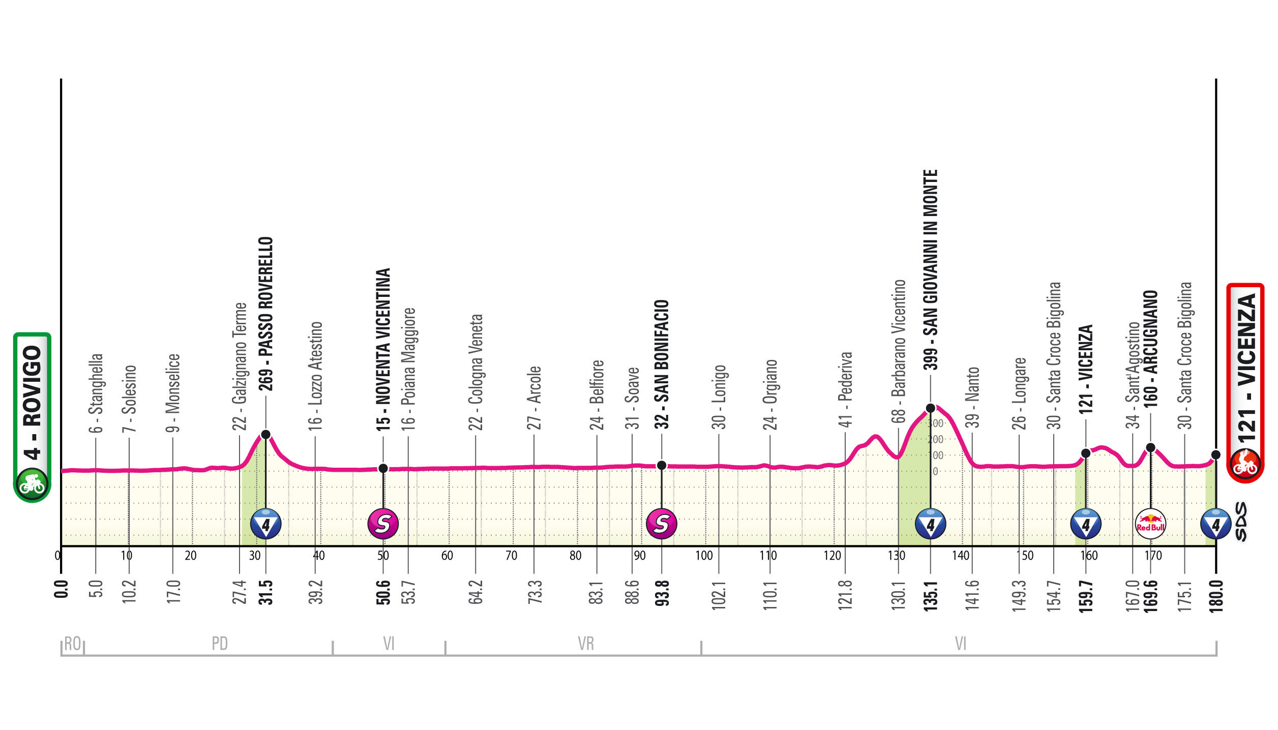Tappa completamente piatta nella prima parte salvo la breve salita di Ppasso Roverello nei Colli Euganei. A 60 km dall’arrivo si entra nei Monti Berici dove si affrontano continui saliscendi e la salita di San Giovanni in Monte. Dopo un primo passaggio sulla line a di arrivo si percorre un circuito di circa 20 km con la salita di Arcugnano (via Pilla) prima del finale al Santuario di Monte Berico. Si percorrono strade prevalentemente rettilinee con carreggiata di larghezza variabile, intervallate dai centri abitati dove sono presenti i consueti ostacoli al traffico.