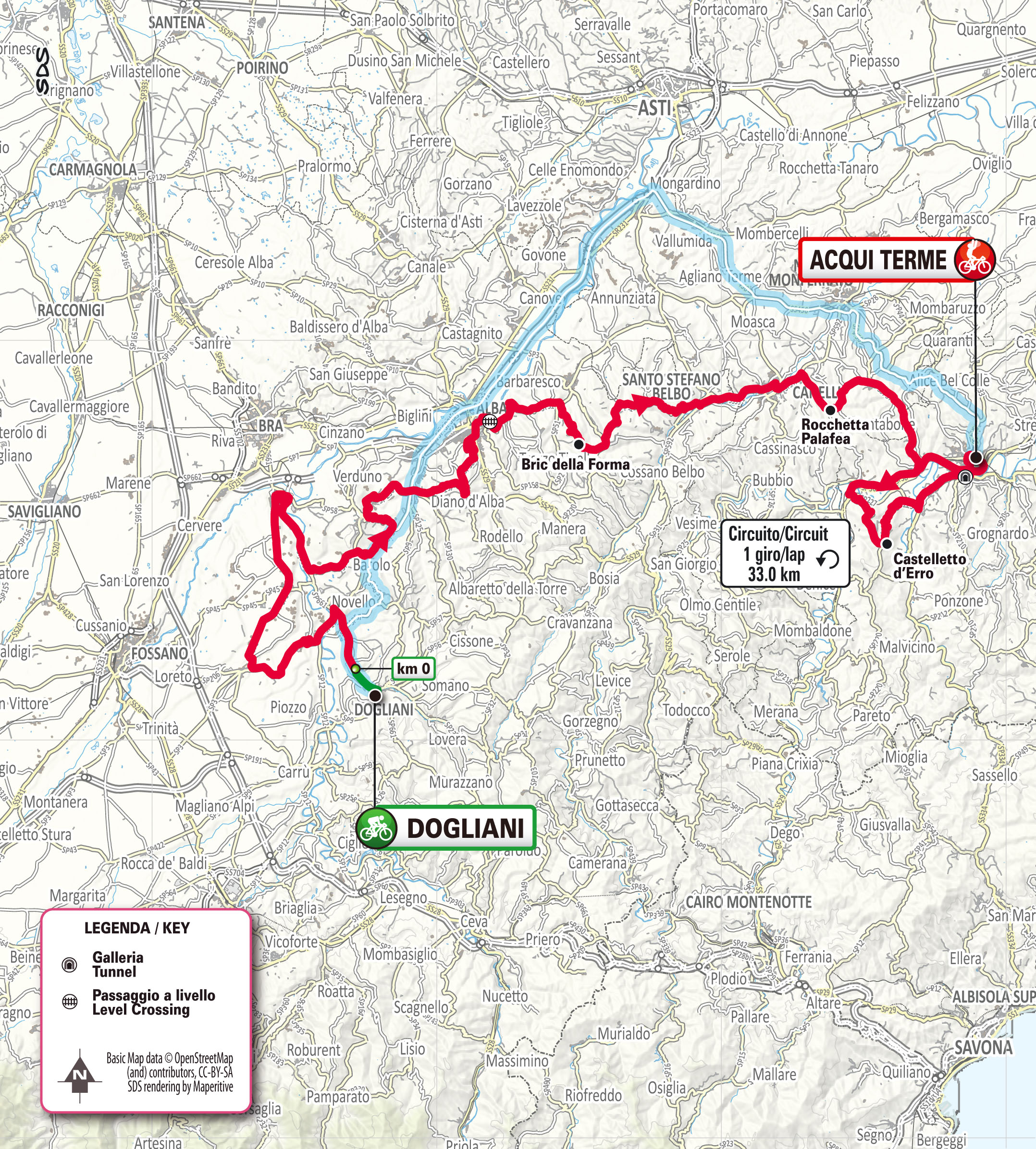 Percorso impegnativo che presenta una decina di salite più o meno brevi tra le quali sono da segnalare il Bric della Forma e Rocchetta Palafea prima di entrare nel circuito finale e la salita di Castelletto d’Erro da percorrere due volte con il suo tratto all’11% con pendenze fino al 15% nella prima parte. Da Dogliani la corsa passa attraverso una lunga serie di salite e discese attraverso Cherasco, Barolo, La Morra, Diano d’Alba fino ad affrontare il Bric della Forma che porta a Santo Stefano Belbo. Segue la salita di Rocchetta Pianfea la cui discesa porta nel circuito finale di 33 km da ripetere una volta dopo il passaggio sulla linea di arrivo. Il circuito presenta un tratto pianeggiante fino alla salita di Castelletto d’Erro. Segue una discesa veloce e impegnativa fino all’ingresso in città.