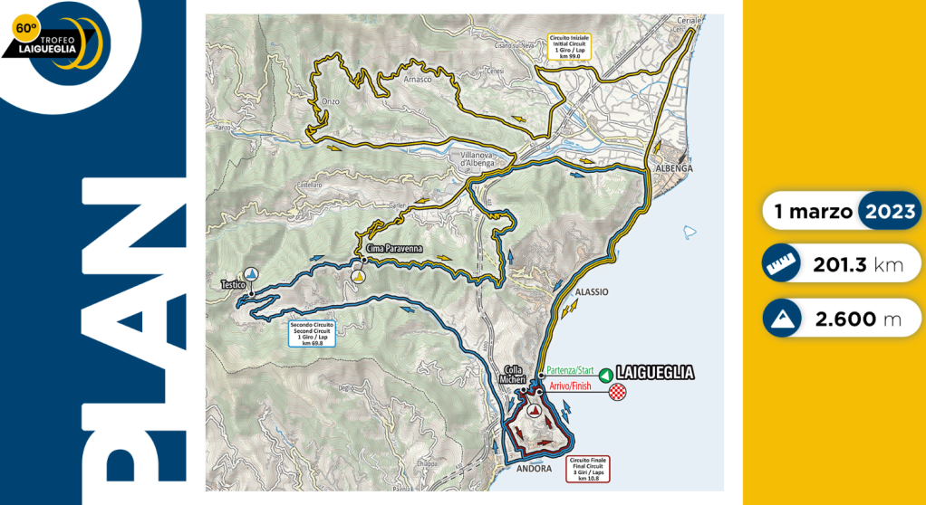 Confermato il percorso che ha saputo regalare spettacolo sportivo nelle ultime edizioni, e che a Genova è stato presentato con un emozionante video-sopralluogo di Davide Cassani in bicicletta. Partenza e arrivo a Laigueglia, 201 km complessivi con due Gran premi della Montagna fino a 80 km dall’arrivo (Paravenna, al km 68, e Testico, al km 122), quando si scende ad Albenga, percorrendo l’Aurelia fino ad Alassio e al ritorno a Laigueglia: mancheranno 44 km e inizierà il circuito finale di circa 11 km, con la salita di Colla Micheri e Capo Mele che si ripeteranno complessivamente per 4 volte.