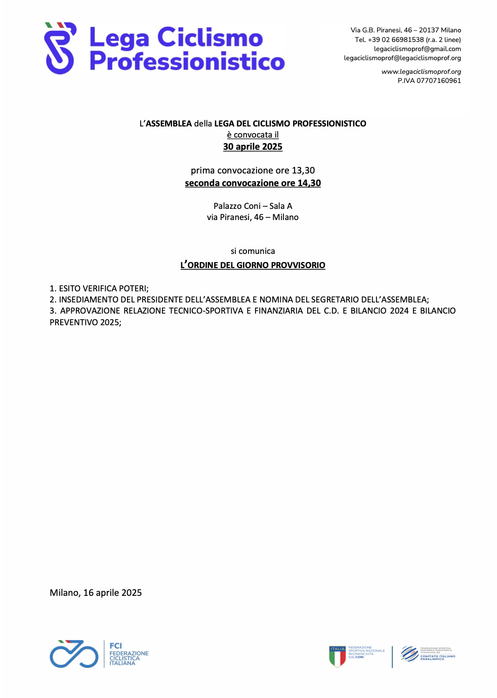 IL 30 APRILE L’ASSEMBLEA DI LEGA CICLISMO PROFESSIONISTICO