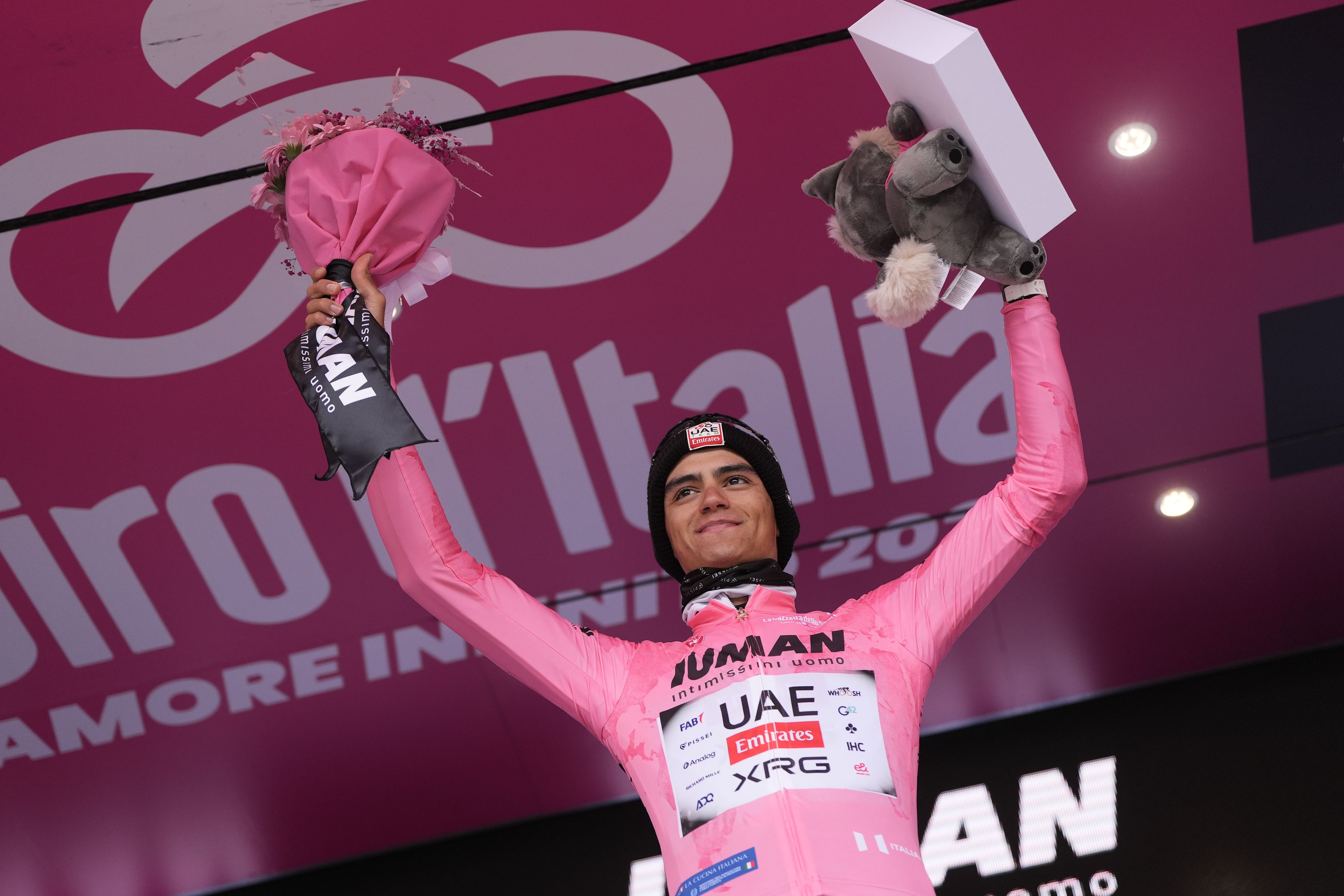 Maglia Rosa, leader della Classifica Generale, sponsorizzata da IUMAN – Intimissimi Uomo – Isaac Del Toro (UAE Team Emirates XRG)