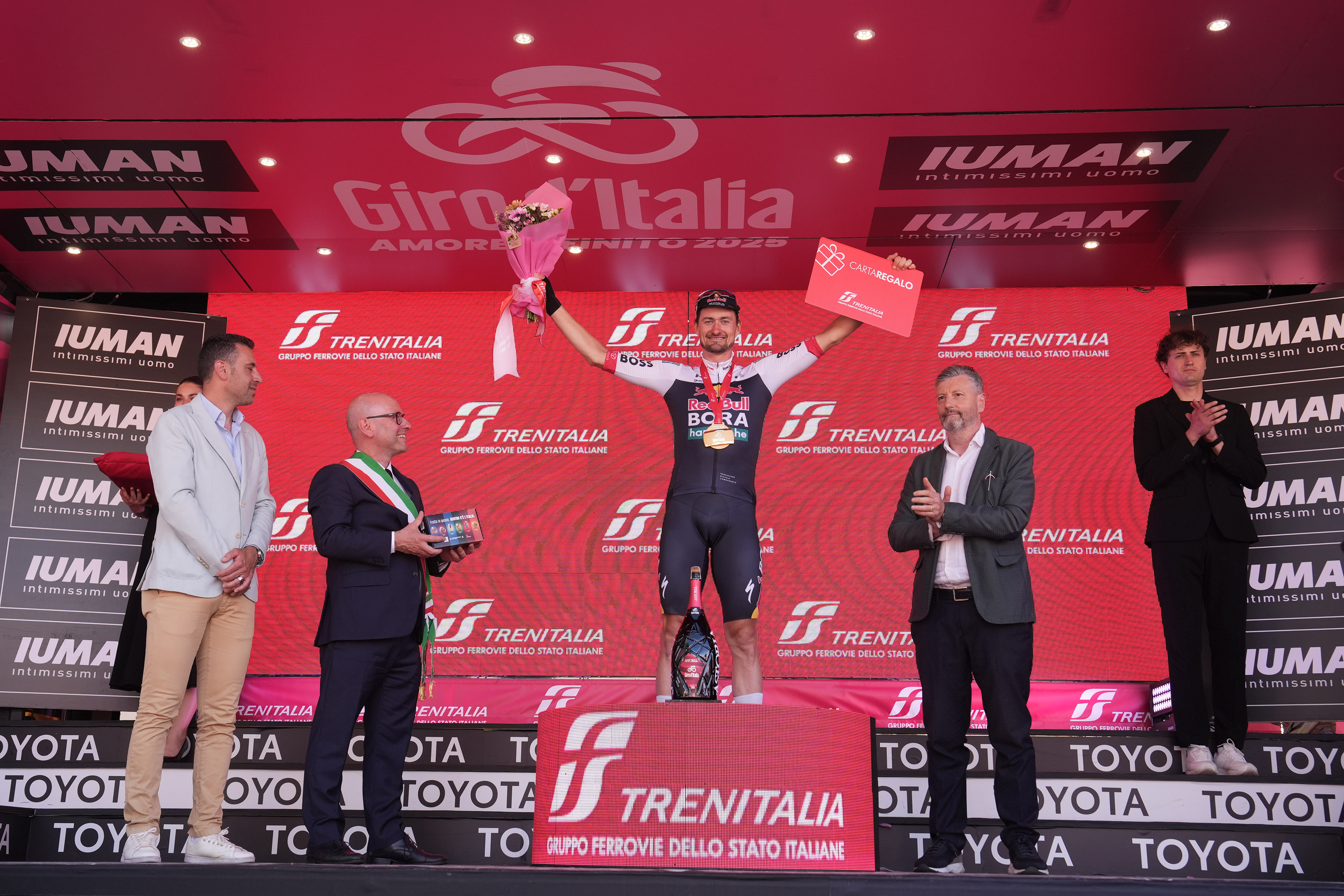 Il tedesco della Red Bull - Bora - Hansgrohe, vincitore di due tappe nel 2023, si impone a Cesano Maderno dopo una lunga fuga. Juan Ayuso costretto al ritiro dopo essere stato punto da una vespa. Domani e dopodomani le frazioni decisive in ottica classifica generale