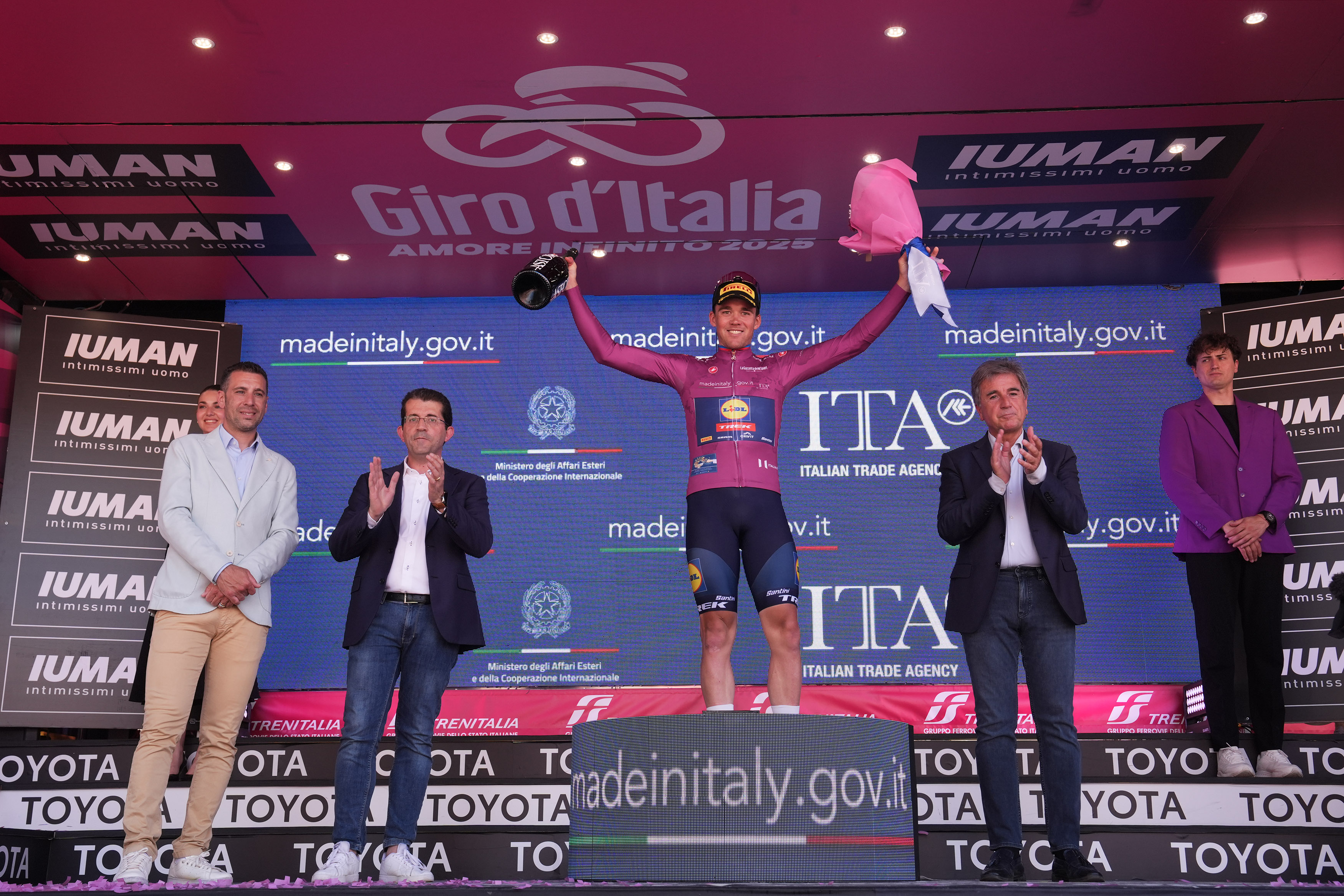 Maglia Rosa, leader della Classifica Generale, sponsorizzata da IUMAN – Intimissimi Uomo – Isaac Del Toro (UAE Team Emirates XRG)