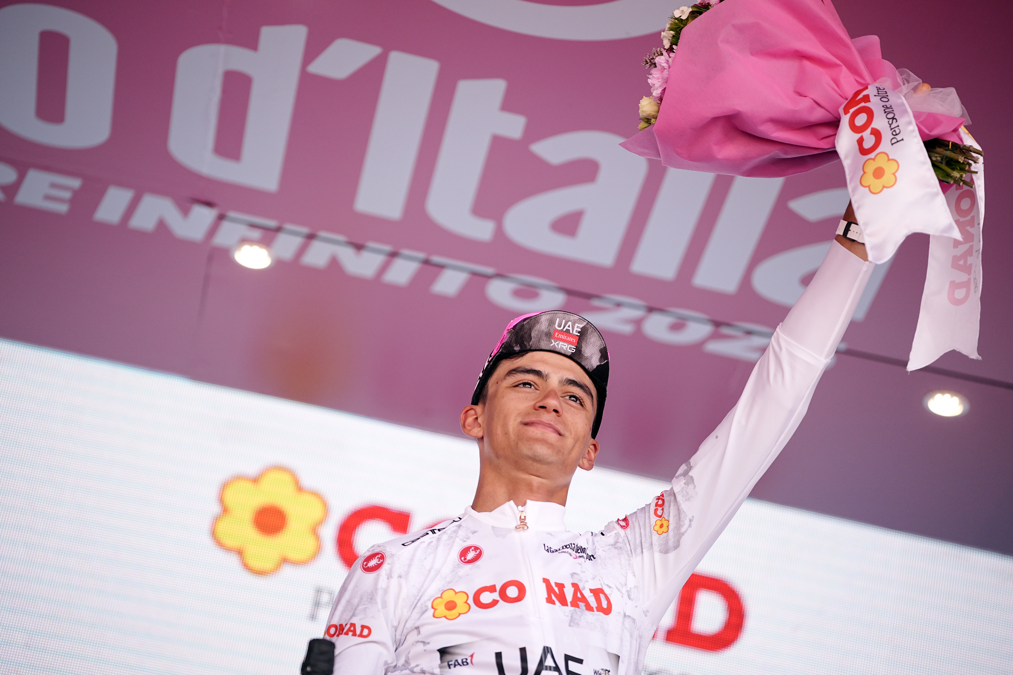 Maglia Bianca, leader della Classifica Giovani, nati dopo il 01/01/2000, sponsorizzata da Conad – Isaac Del Toro (UAE Team Emirates XRG) – indossata da Giulio Pellizzari (Red Bull – Bora – Hansgrohe)