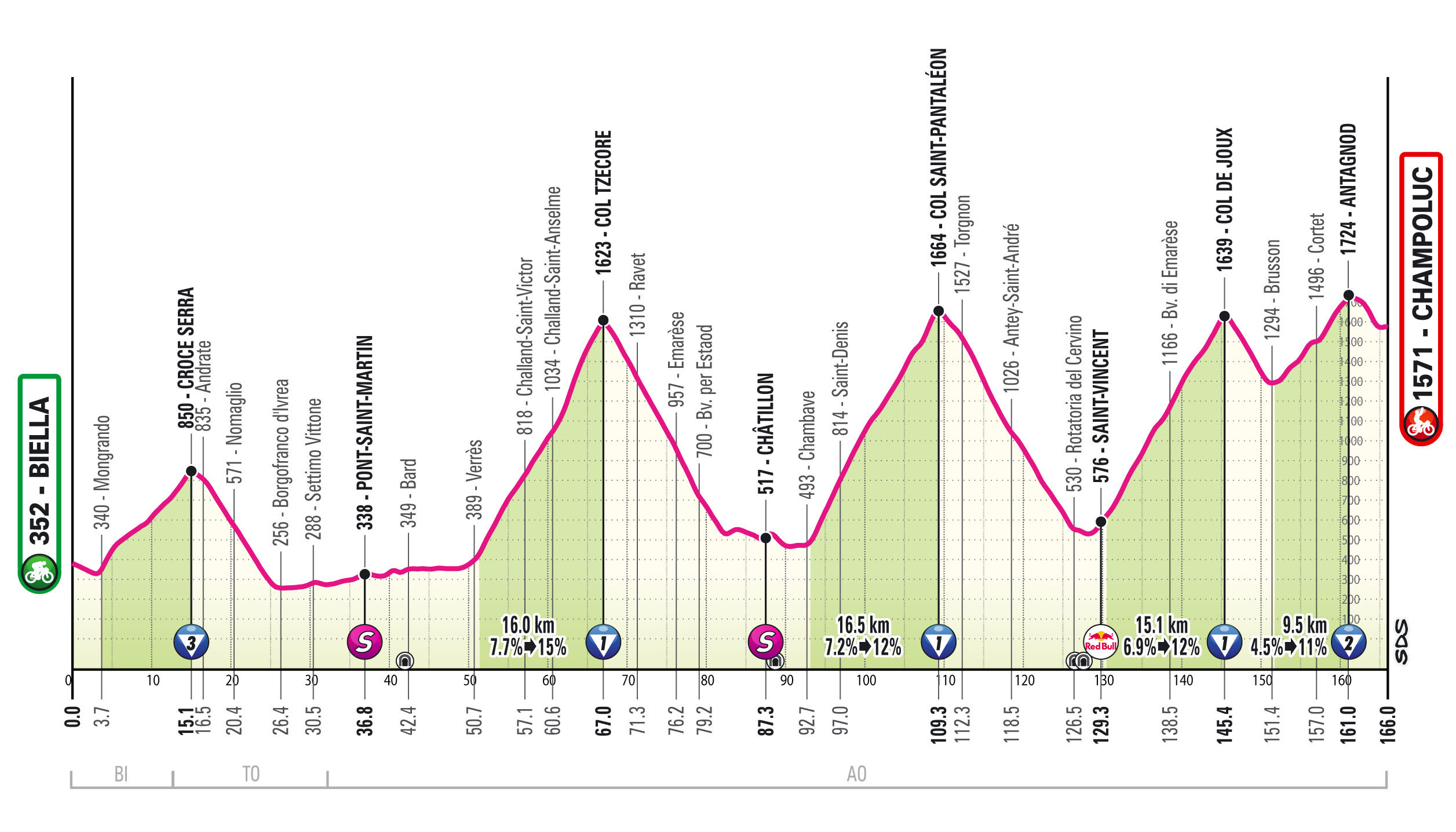 Tappone alpino fatto di sole salite e discese. Al km 4 prima salita a Croce Serra per entrare nella valle della Dora Baltea. Breve falsopiano fino a Verrès e poi tre lunghe salite da circa 15 km l’una senza respiro fra loro. Si scalano il Col Tzecore (con lunghi tratti oltre il 12% negli ultimi 4 km), il Col de St. Pantaléon e il Col de Joux. Terminata la discesa su Brusson inizia l’ultima parte sempre a salire con il passaggio da Antagnod (pendenze fino all’11%) che termina a 5 km dall’arrivo.