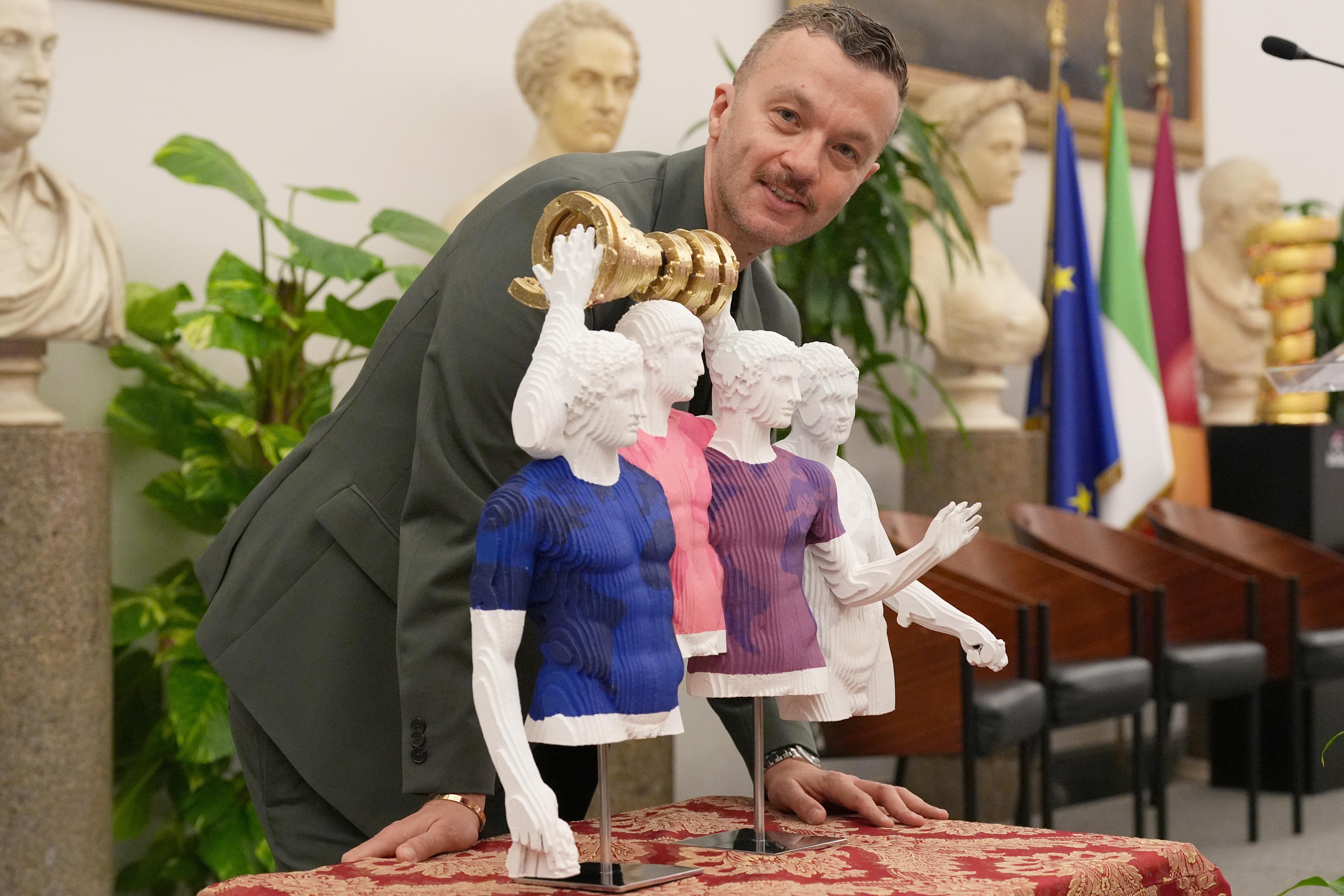 I relatori della conferenza stampa. Al centro Urbano Cairo con il Trofeo Senza Fine. Roberto Gualtieri e Alessandro Onorato con la Maglia celebrativa del Grande Arrivo di Roma