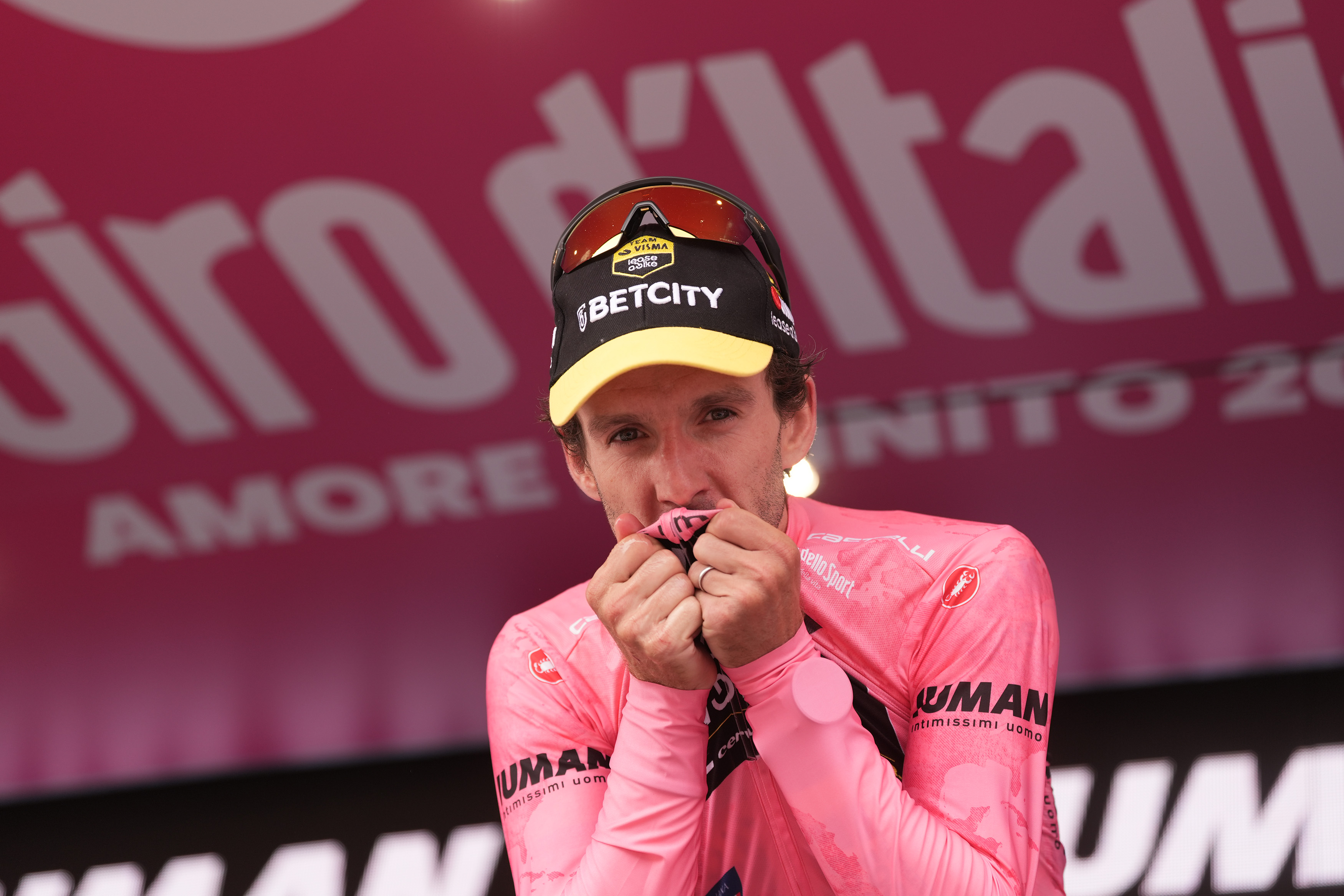 Maglia Rosa, leader della Classifica Generale, sponsorizzata da IUMAN – Intimissimi Uomo – Simon Yates (Team Visma | Lease a Bike)